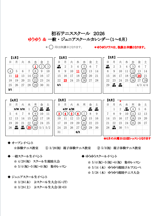 2026年 1月~6月のスクールカレンダーを掲載します
