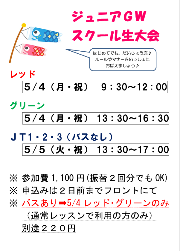 ジュニアGWスクール生大会を開催します